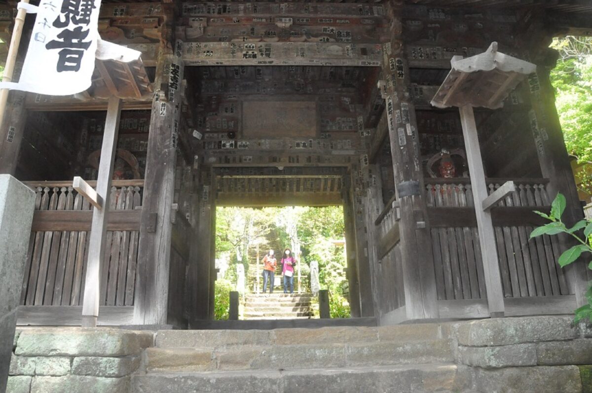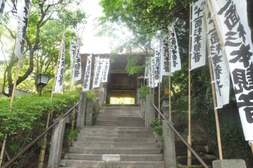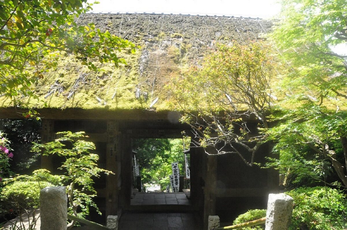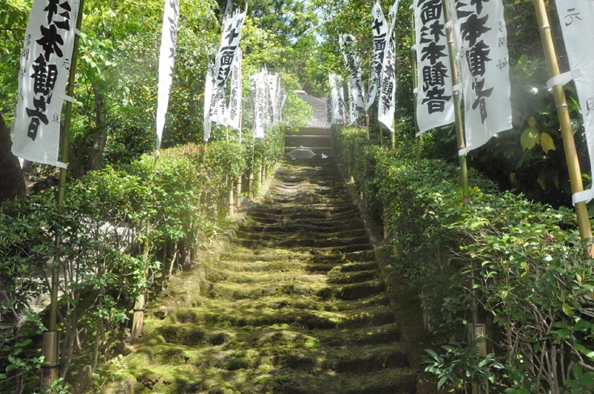 正面には鎌倉最古のお寺である杉本寺の「苔の石段」が見える