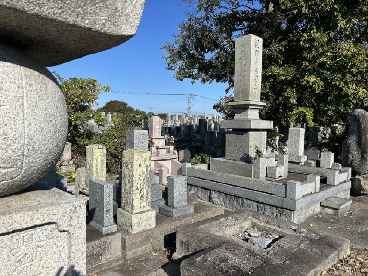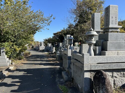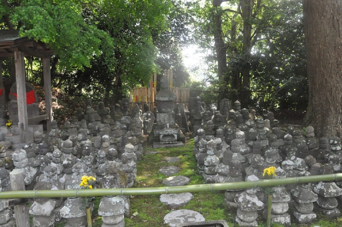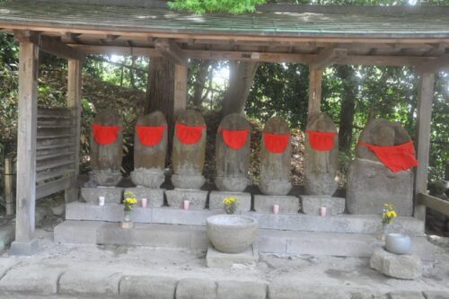 たくさんの五輪塔群と赤い胸当てをした可愛い7体のお地蔵さんが祀られています